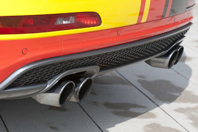 Tout d'abord, on peut apercevoir que la teinte de ce Q3 ne passe pas inaperçu, il arbore fièrement les couleurs du drapeau Allemand (peinture disponible en option). La suspension a été abaissée, un nouveau diffuseur arrière incorporant quatre sorties d'échappement est présent, ainsi que des jantes alliages 20 pouces signées MTM Bimoto chaussées en 255/35 R20.